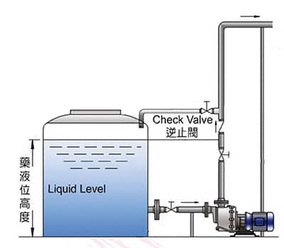 1、當應用于抽送儲存槽中的化學藥水時,請放入口加裝閥門,維修上更便利。