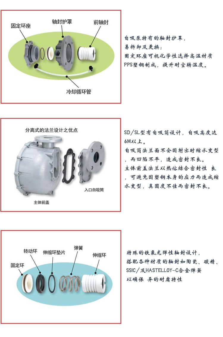 LD型同軸自吸式耐酸堿泵采用氣液外混式設計原理,水泵結構更加完善。 化水力模型,提高自吸能力和 綜合性能。采用動力密封結構,取消傳統的機械或填料密封,做到無密封自吸。可根據介質的品種選取 相應材料制作自吸泵。